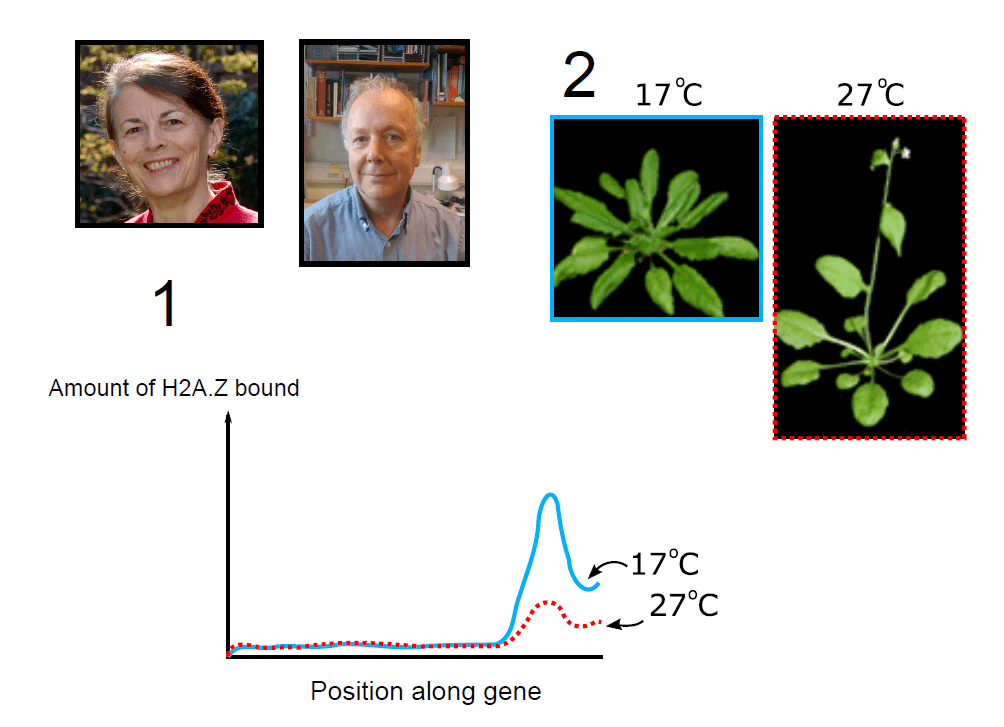 _ Ở nhiệt độ cao, cây ra hoa biểu thị cho thấy rằng gen tiền ra hoa được biểu hiện mạnh hơn, từ đó có thể suy ra được có ít H2A.Z bám vào gen tiền ra hoa hơn.